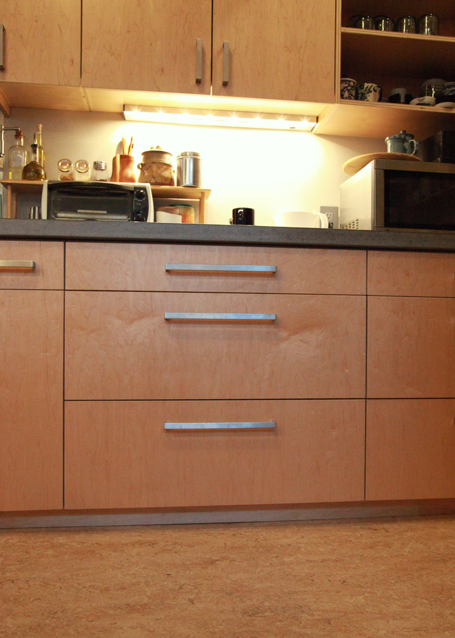 Cabinets are made locally from FSC certified prefinished maple veneer plywood with no added urea formaldehyde.
