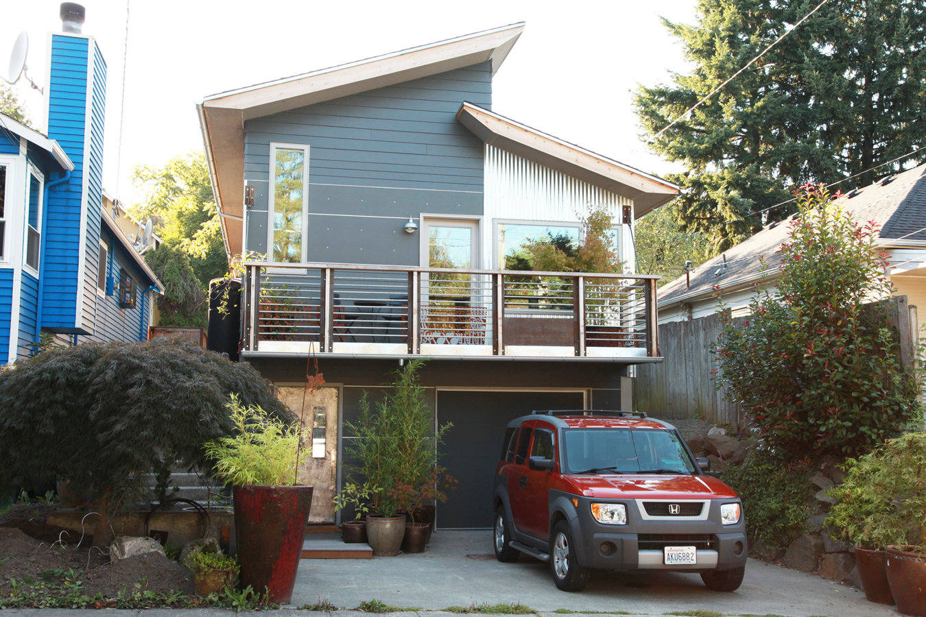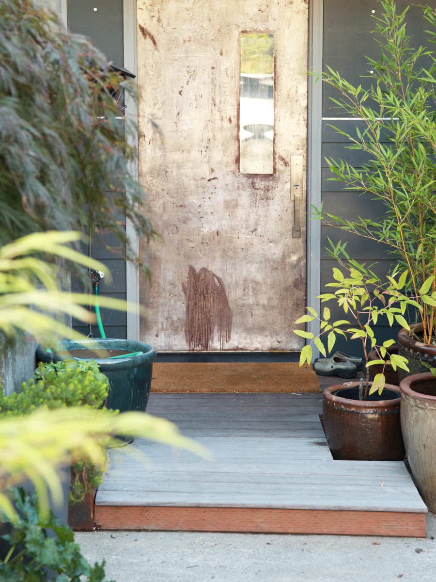 The exterior of the home was transformed significantly by changing the structure of the roof to create space for solar panels and allow natural light to come in from high clerestory windows. We added a “garden balcony” in front to allow for container gardening, as well as a translucent roof over the existing back patio to create an outdoor garden room. Here are some before photos of the front and back: