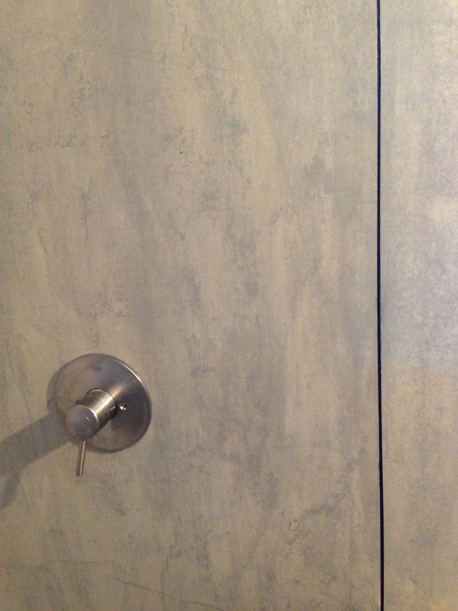 In order to keep costs down, we explored ways to use materials creatively — the shower is “tiled” with stained, sealed hardipanel (a product typically used for siding houses) and the patio roof is designed with inexpensive structure and twin wall polycarbonate (usually used for green houses).