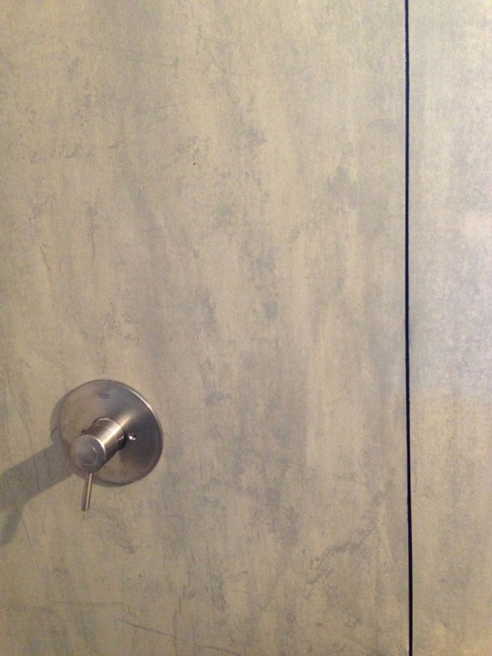 Stained and sealed hardipanel (fiber cement siding product) used for tiling the shower. Photo by Parie Hines.
