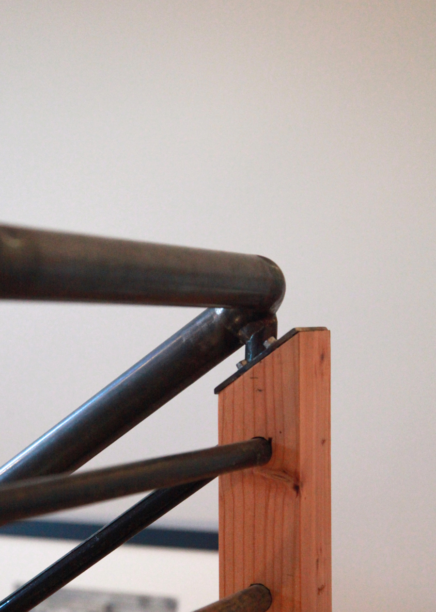 Stair railing posts milled from door headers salvaged onsite.