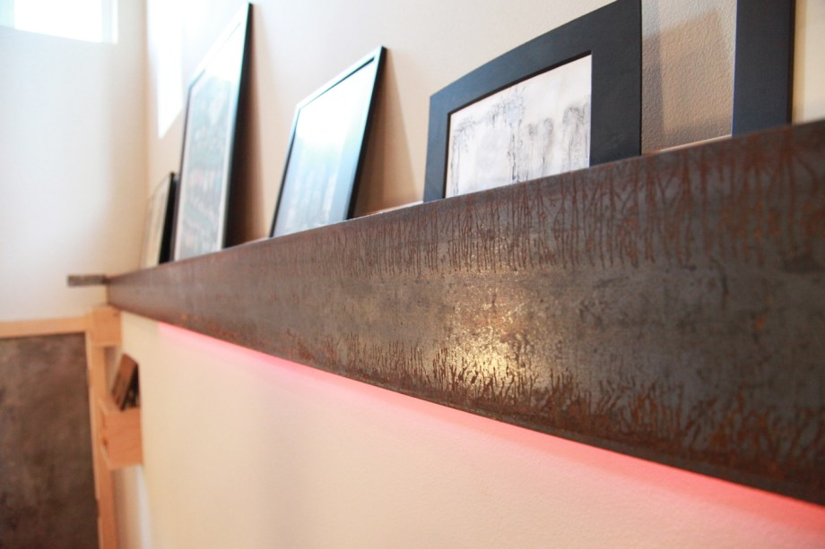 A steel beam required for retrofitting the structure becomes an art shelf and lighting element at the entry.