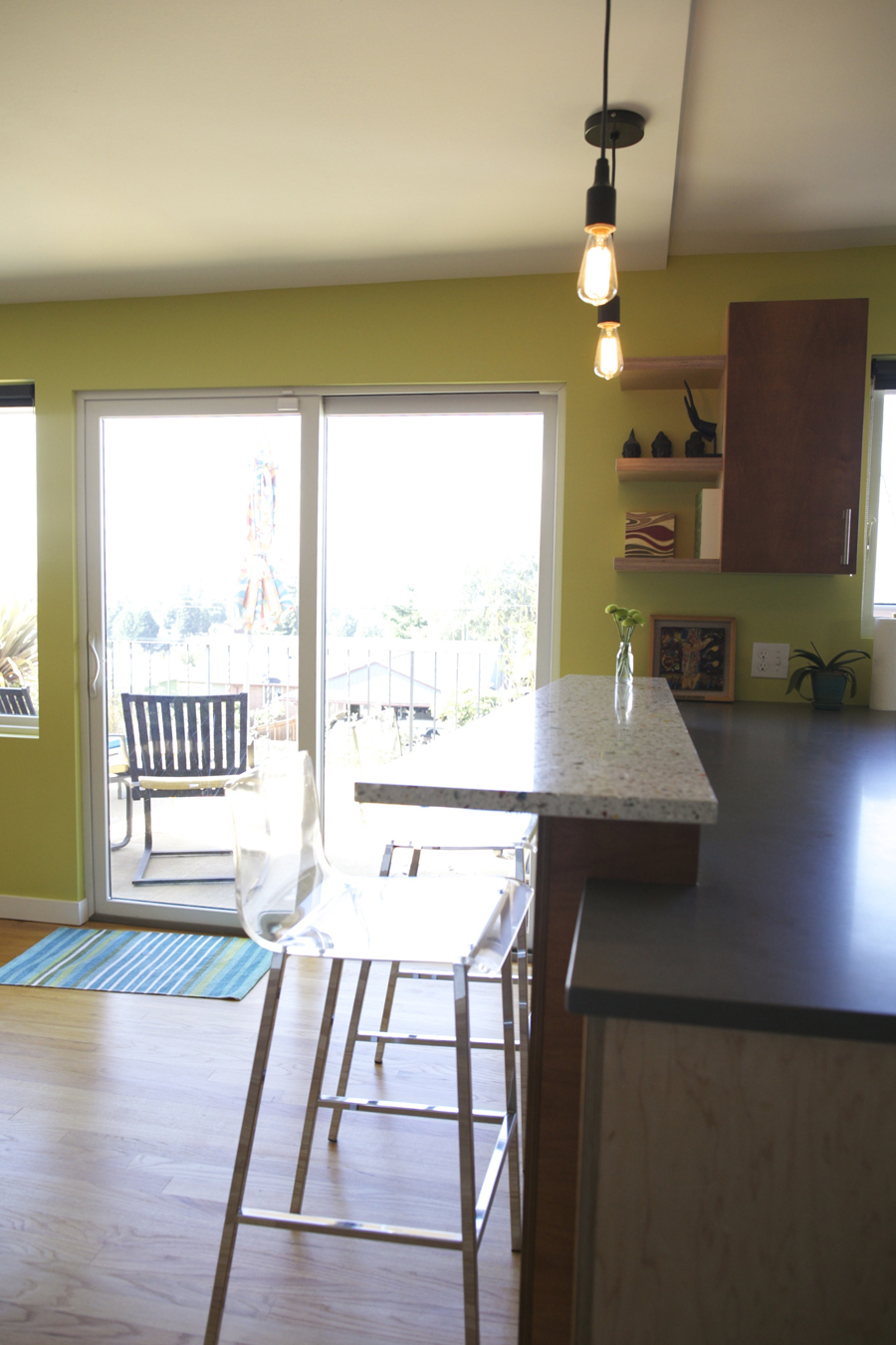 Sliding glass doors at the kitchen bar open to the deck beyond.