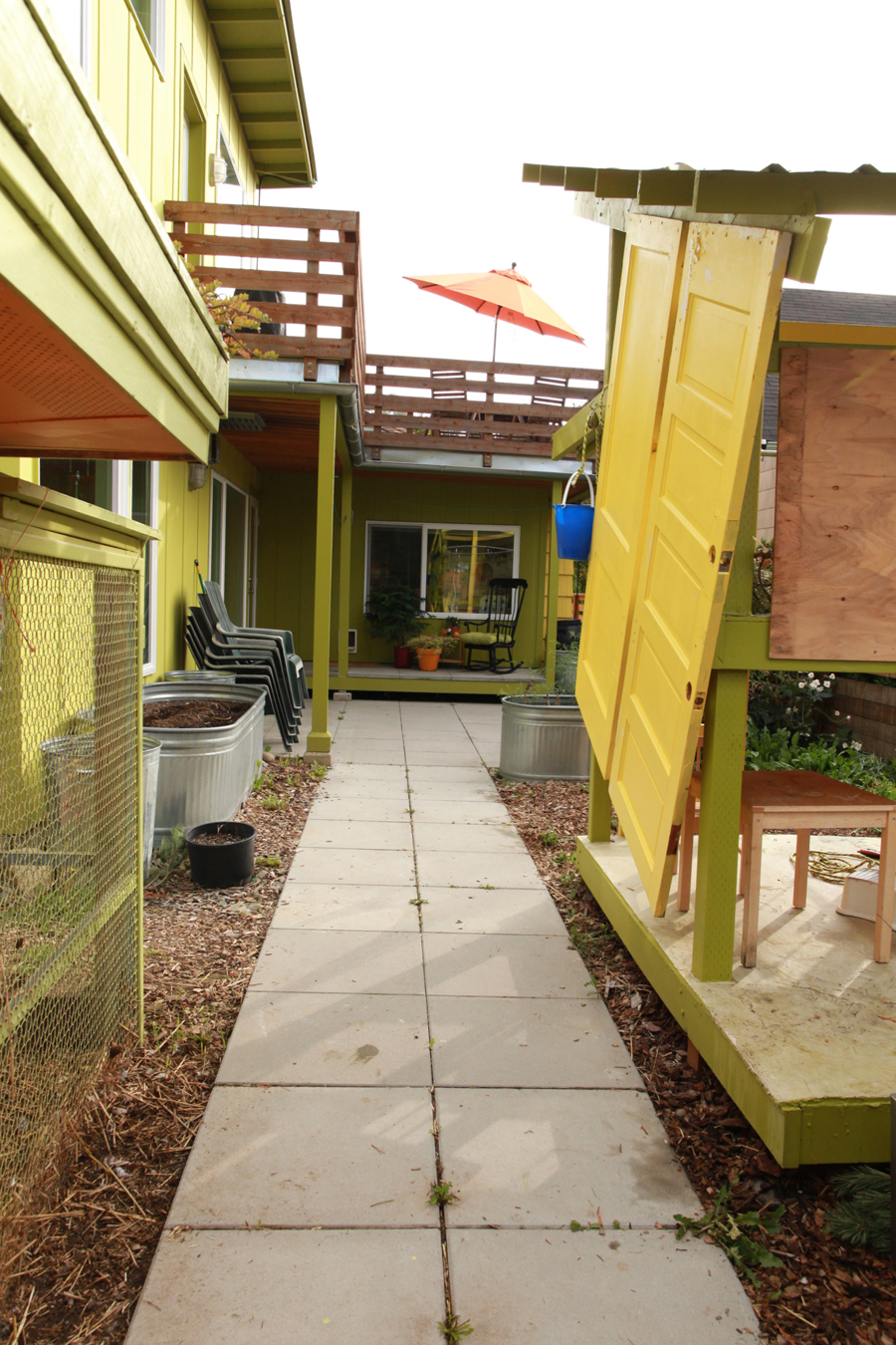 A view of the backyard, with chicken coop on the left and playhouse on the right.