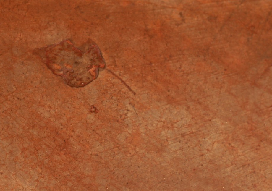 A leaf caught in the stained concrete floor.