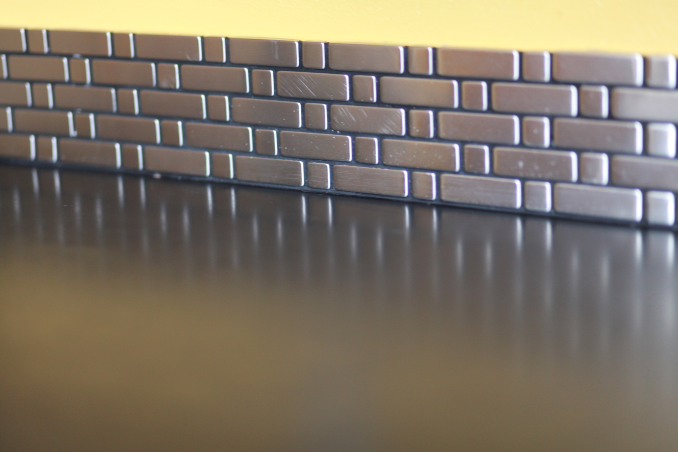 Stainless steel tile backsplash with salvaged slate countertop.