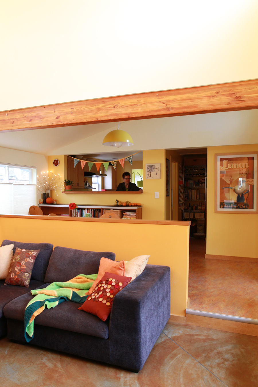 The new “fireplace room” is the center of the home. In the right photo below, you can look back towards the original house — the pass through window is in the former back wall of the house.
