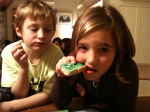 I have gotten a few queries, so I feel I should give an update on the Green Urban Gingerbread House recycling program. While there was 100% recycling of jobsite waste during construction (yum), I was concerned that we might have trouble when it came time for demolition. But I was able to find just the right crew to tackle the job at a new year’s party. Seven children and a handful of adults took the house down in a matter of minutes, with comments like: “Have you tried the solar panels? They’re delicious!” and “Can I have a bite of the green roof?”