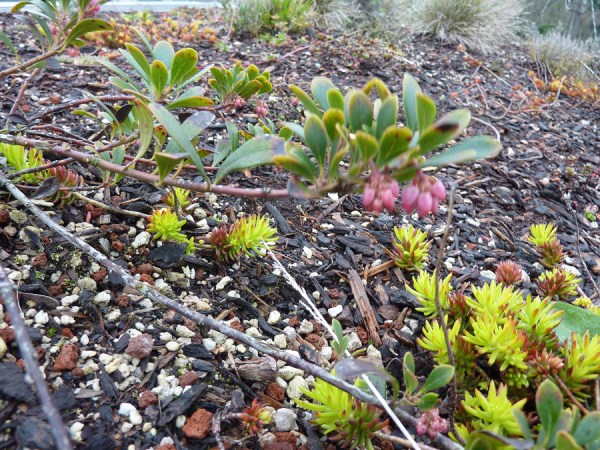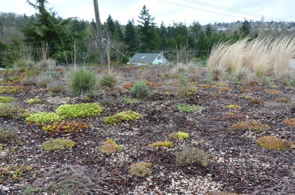 Here is a photo from the installation of the green roof in October 2009 for the sake of comparison. I did not include many grasses in the landscaping plan, as I have heard from many green roof owners that grasses will grow quickly and can take over and choke out other plants, so I am hoping to see the sedums, lavender, strawberries, thymes, and kinnick-kinnick get well established this year.