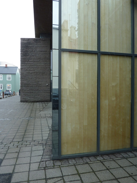 And here is an interesting cladding detail that allows the beauty of pale wood to endure the harsh climate. Rather than try to maintain a layer of waterproof sealant over the wood, which would need constant reapplication, the wood is covered with a glass veneer. This may also be a good strategy for the chilly climate of Reykjavik (with a summer average high temperature of 57 degrees F), because the glass would also create a warm airspace when it is sunny. It is similar in concept to a Trombe wall, although I saw no evidence that the warm air was being used directly in heating the building. However, it would definitely create a warmer microclimate right at the exterior of the wall, which would reduce the amount of heating needed for the building. An interesting idea that might be adapted to be useful in the Pacific Northwest.