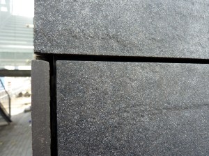 The stone tile veneer is designed as a rainscreen wall, which means that the tiles are mounted with a space between the back of the tiles and the face of a (hidden) drainage plane. In other words, the moisture that makes it through the cracks between the tiles can drain freely down the surface of the wall behind.